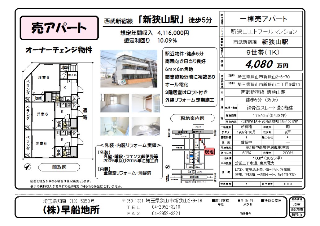 価格 価格 4,080万円 所在地 狭山市新狭山2-6-70 地積 100.00㎡ 最寄駅 西武新宿線 新狭山駅 徒歩5分 構造 鉄骨造スレート葺3階建て 築年月 1987年10月 現況 賃貸中 間取 1K(洋室6帖+台所2.5帖・18㎡)× 9世帯 建築面積 179.46㎡ 土地面積 100.00㎡ 接道 北西角地 / 北6m公道・西6m公道 物件概要 東京電力、公営上・下水道